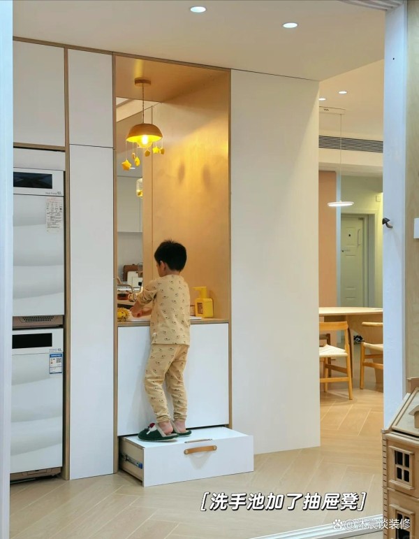 可以学@抱相机的兔子家这样来设计,在洗手池的底部加了抽屉凳,抽屉凳拉出来就是垫高凳,孩子可以站在上面去洗手,而且这个抽屉凳还能收纳一些清洁物品。他们长大了不用这个垫高凳了,依然很实用。