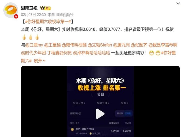 《你好星期六》摘得本周“收视桂冠”!这位耀眼嘉宾登场果然不负众望
