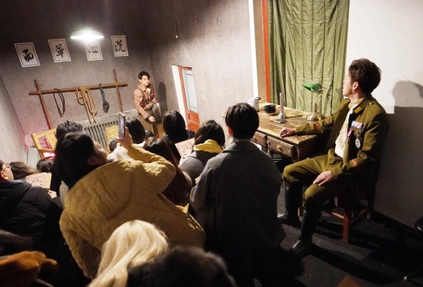 《宋美龄耳环丢了》彻底打破了传统镜框式舞台的边界,将剧情和表演揉进颜料会馆的庭院、厅堂和廊道。五个空间里有五重情境,观众跟随情节游走其间,时而“审问”嫌疑人,时而复盘案件细节。演员就在身侧表演,微表情尽收眼底,每一句台词都可能抛向观众,观众的每一个提问都可能换来更多的线索。