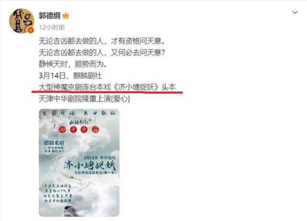 当然,也许郭德纲也意识到不提京剧只说“郭剧”不太好,他在3月10日的第二次宣传时还是在《济小塘捉妖》前面加上了“京剧”二字。