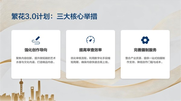 而此次重磅发布的《上海微短剧「繁花」3.0计划》为产业高质量发展提供了强大支撑,将从强化创作导向、提高审查效率、完善摄制服务等方面促进微短剧内容的精品制作和题材拓展。具体措施包括在上海建立微短剧主题创作选题库、推出“2天完成备案、5天上线”的极速审核机制、新增96个拍摄场景支持创作等。