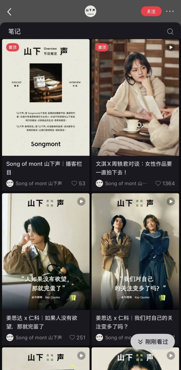 除了赞助节目,不少品牌也开始亲自下场打造播客IP。轻奢箱包品牌Songmont推出的视频播客《山下声》,对话不同领域与品牌调性相契合的嘉宾。