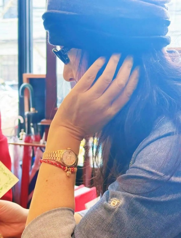 她的打扮也很考究,牛仔衬衫挽起衣袖、刚好露出手臂上的腕表,还配了一条红色黄金手链,眼镜也是迪奥的新款,打扮潮流精致。