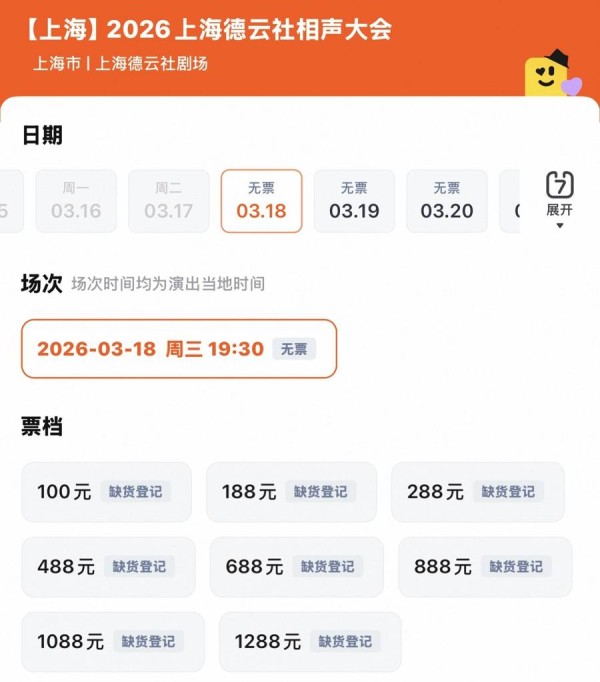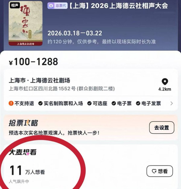 2026上海德云社相声大会票价从100元至1288元共分为八档。此前,1288元的最高票价曾引发部分网络热议;如今,市场反应给出了真实答案——9场演出所有门票在4分钟内售罄。截至发稿时,大麦平台上标注“想看”演出的人数已飙升至超过11万人次。