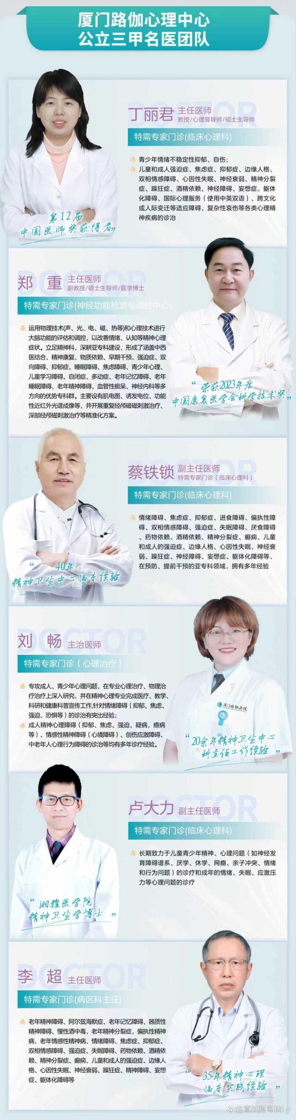 针对青少年心理特点与常见问题,多位专家形成精准诊疗与疏导特色:丁丽君主任医师擅长青少年情绪障碍疏导与认知调整,结合中英双语服务,适配有多元沟通需求的青少年;郑重主任医师擅长运用神经调控技术与心理干预结合,缓解青少年重度焦虑、抑郁引发的情绪与行为问题;李超主任医师聚焦青少年与家庭联动干预,改善亲子沟通模式,从根源化解心理冲突;卢大力副主任医师深耕青少年心理领域,擅长学业压力、同伴关系、青春期叛逆等问题的疏导,用青少年易接受的方式建立信任;蔡铁锁副主任医师擅长青少年心理问题早期筛查与干预,及时阻断问题加重,守护心灵成长;牛一丁心理科主任精通多模态联合治疗,针对性应对青少年顽固性情绪障碍;刘畅主治医师擅长青少年康复期心理建设,引导其建立积极心态与情绪调节能力,助力回归校园生活。专业守护下,青少年可平稳度过成长关键期。