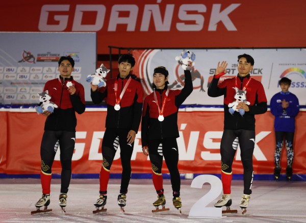 在2025-2026赛季国际滑联短道速滑世界巡回赛暨米兰冬奥会资格赛第三站男子5000米A组决赛,中国队选手刘少昂、孙龙、林孝埈、刘少林(从左到右)在颁奖仪式上。新华社记者 高静 摄