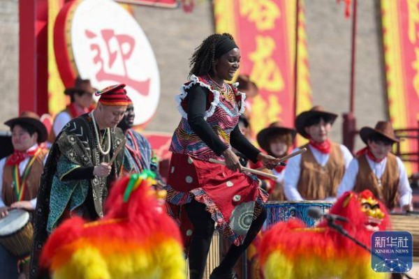 ↑ 3月15日,演员在河北省石家庄市正定古城进行“非洲鼓”表演。新华社发(张晓峰 摄)