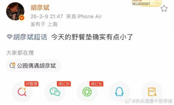 有网友精辟总结:“胡彦斌的野餐垫上,铺开的是内娱最稀缺的清醒——能随时抽离浮华,才证明从未被浮华驯服”。