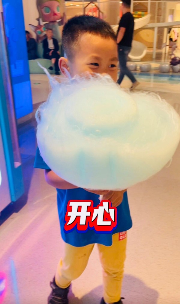 二宝亲手从机器里取出来,慢慢品尝着,嘴角两边粘上了蓝色的糖沫,很满足。