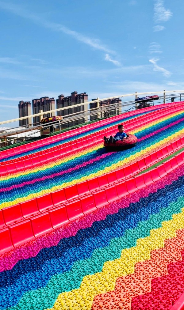在济南玩了一个超长的彩虹滑道,开始是爸爸妈妈分别陪着二宝一起玩,后来工作人员鼓励二宝,让他自己玩一次试试,二宝勇敢地同意了。没想到,丝毫没有惧怕,滑得非常顺利。