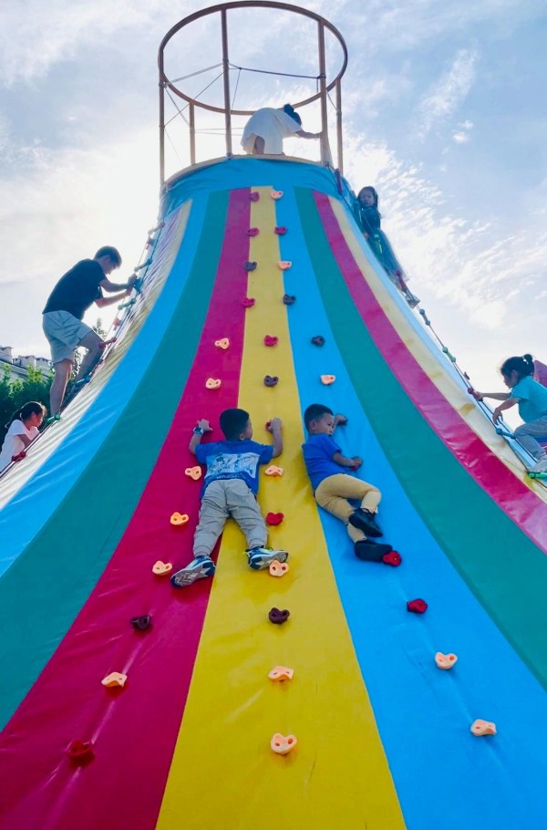 一起玩的有好几个小朋友,他们一起滑下去,然后再一起走100米左右的楼梯上去,结伴玩得非常开心。