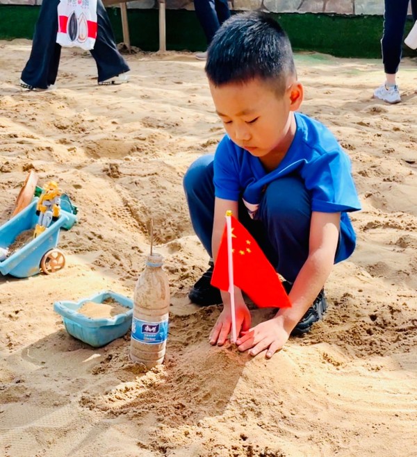 当时没有带玩沙工具,就地找了一个残破的车斗、水瓶、小杯子、小木棍,再搭配上自己带的机器人、小国旗、小挂件,玩起了场景游戏。