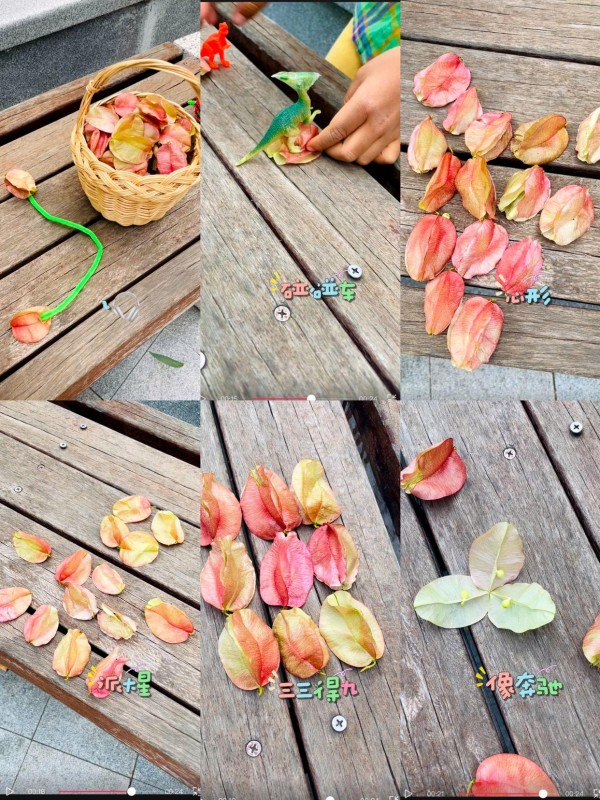 我们捡了很多栾树的花,装在小篮子里,就地做了一些手工,发现二宝很有创意。