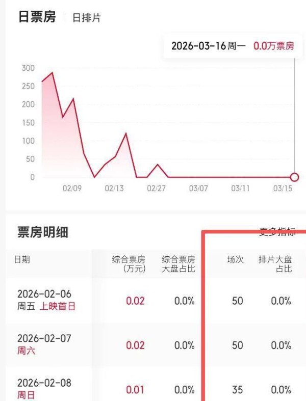 到了3月初,全国仅剩江西省一家影院还有一场排片,场均人数为0,彻底被市场遗忘。