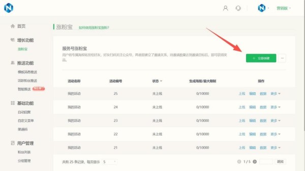 Step1:登录乔拓云公众号助手,进入【营销功能 - 涨粉宝】,点【立即创建】,然后让管理员扫码授权公众号,10 秒就能搞定;