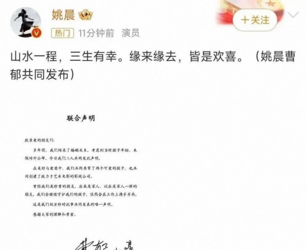 姚晨官宣离婚:夫妻共同发布声明 已离婚多年