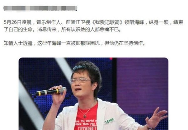 又一明星因抑郁症离世,知名歌手海峰跳楼自杀,年仅39岁。