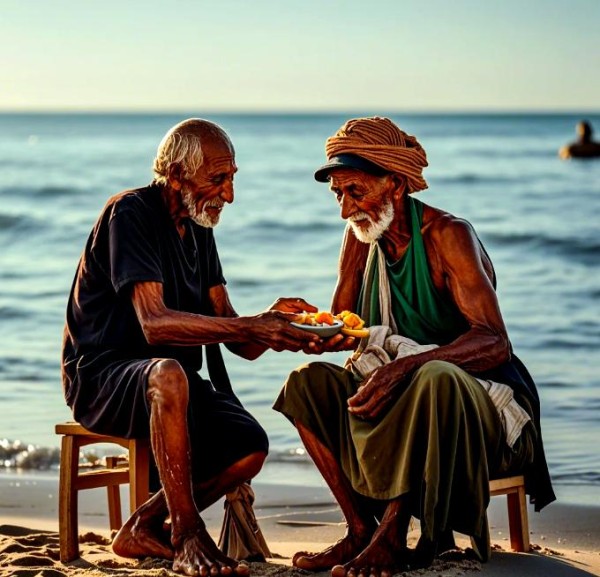 在沙滩上,一个乞丐向一位老者乞讨食物。老者却答非所问,调侃道:“现在你可以安心游泳,不用担心抽筋了。” 老者的回应充满了讽刺意味,他并未对乞丐的困境表示同情,反而以其困境为笑料。