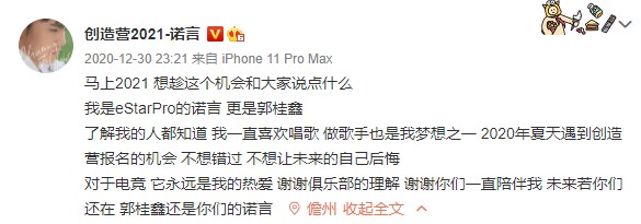 据悉,诺言参加创造营是想圆自己一个唱跳梦,有梦想谁都了不起,有梦就去追万一真的实现了呢!诺言上这个节目也有着其他人没有的优势,首先是知名度,诺言在当职业选手时就有很高的关注度,粉丝也是只多不少,即使刚开始表现得不好粉丝也是会尽力为他投票;其次是人设,只要王者荣耀职业选手这个人设立得住、够好,就算唱跳rap都差,只要足够讨喜观众缘好,进入决赛也不是没有可能的;最后就算是被淘汰了,又有了一波热度和粉丝,重回职业选手的行业也是完全行得通,毕竟这是一个流量至上的时代,只要你有流量,不愁没有代言找。