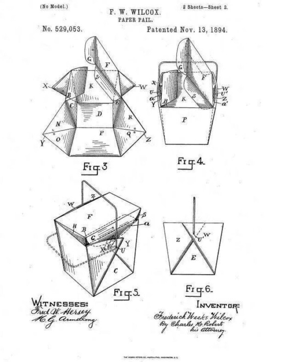 那么,这张画又怎么被印上了外卖盒并且与中餐外卖绑定在一起呢?这就要追溯到外卖盒的前身。这种白色的外卖盒被称为牡蛎盒,最早不是用来装美式中餐外卖的,而是装牡蛎的。19世纪20年代,美国盛产牡蛎,当时牡蛎价格不高,是很流行的平民美食,小摊贩把新鲜牡蛎装在纸盒里,挤上柠檬汁就是一份街头美食。1894年,芝加哥发明家弗雷德里克·威克斯·威尔科克斯给这种盒子注册了专利并正式命名了。不过当时牡蛎盒是纯白色的,并没有印刷图案。