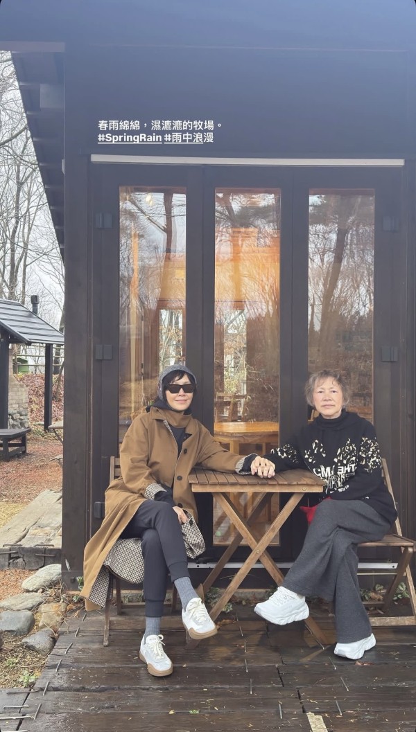 刘嘉玲除了晒出景观的照片,少不了的还有与家人一起的合照。一家人在这个牧场中咖啡厅歇息,出镜的有刘嘉玲的弟弟,弟媳,以及老母亲。刘嘉玲与家人在咖啡厅门口的桌子前坐着合照,当天天气寒冷,只见刘嘉玲包裹了全身,身穿驼色大衣,还戴上了棉帽以及墨镜,俨然就是一副贵妇的装扮。
