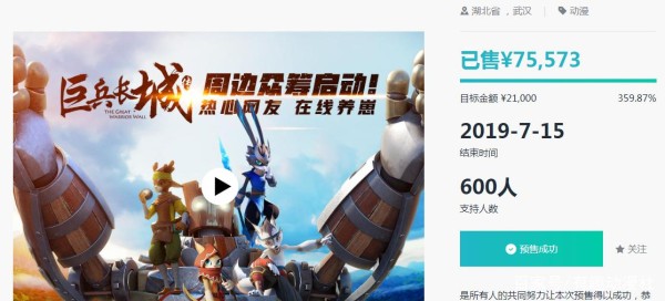 在文化创意领域的众筹平台摩点上,武汉两点十分动漫推出的《巨兵长城传》项目众筹,金额设置不高,多以回馈粉丝为主,产品也多以等身抱枕、挂画、海报、钥匙扣、立牌、纪念币、徽章等产品为主,价格从28——288元不等,粉丝买单的热情却非常高,最终筹集的金额达到近300%!虽然不到7万的金额相比很多的大IP来说微乎其微,但足以让人看到动漫IP背后巨大的周边、衍生品市场。