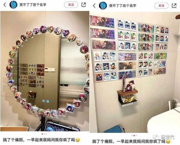不久前,一条“爆改二次元厕所”的笔记登上小红书热榜,博主把游戏角色的徽章360°环绕贴满梳妆镜,立牌摆上纸巾架,文件夹当背景墙。这个“妈见打”的厕所,吸引了数十万网友围观和上万点赞,还有数千收藏量暗示了一群人的“臭味相投”。