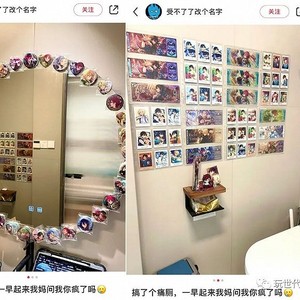 圈里有一个玩法叫“摆阵”,指把收藏的谷子平铺到房屋的每个角落,极具视觉震撼力。虽然“摆阵”往往是为了给角色庆生等,是个颇具仪式感的玩法,但用谷子装饰美化空间的趋势愈发明显。痛柜、痛墙、痛屋、甚至痛厕,极致的场景下沉。