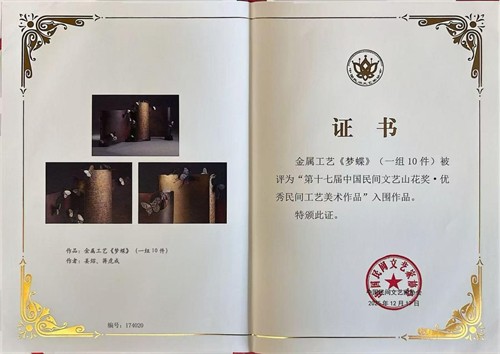 此次入围的金属工艺《梦蝶》(一组10件),由深耕金属工艺二十余年的工艺美术师姜炤与蒋虎成联合创作。作品以《庄子·齐物论》中“庄周梦蝶”的经典哲学意象为核心,以金属为主要创作材料,通过精湛的锻造、雕刻工艺,将蝴蝶的灵动形态与金属的厚重质感完美融合,在冷硬的金属材质中传递出古典哲思与当代审美,兼具艺术价值与工艺水准。该组合此前曾凭借作品《橘韵》《茗乐》等多次亮相省级工艺美术展览,其创作的金属工艺作品多次入选省级重要展览,此次入围山花奖,是对二人匠心与创新的认可。