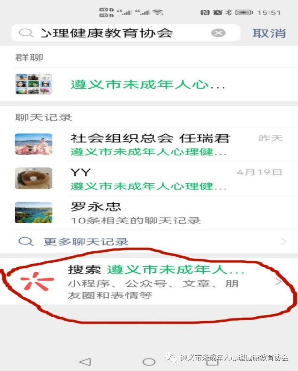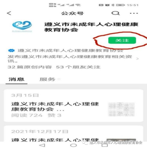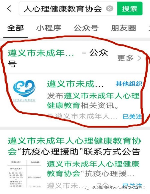 1.打开微信--点搜索--点公众号,输入“遵义市未成年人心理健康教育协会”或直接扫描协会公众号二维码,关注该公众号。