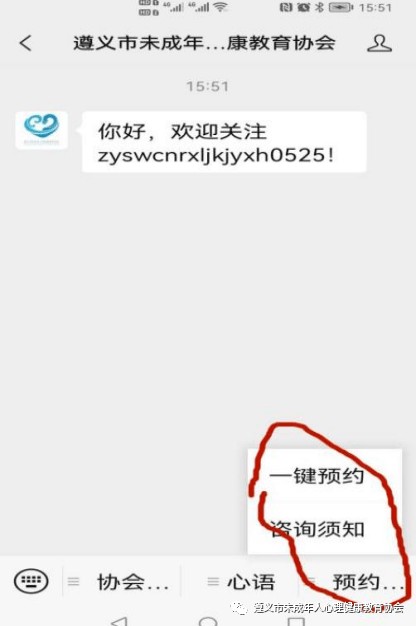 为方便大家操作,现将遵义市未成年人心理健康教育协会在协会公众号一键预约模式的具体操作步骤告知如下: