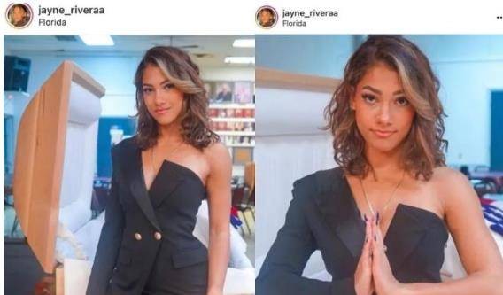 这件事就是活在一位20岁的网红,名叫Jayne Rivera,她是一位来自佛罗里达州的网红和模特,她近日在自己的ins账号上po出了这样一组照片。仔细看就知道了,她穿性感服装参加父亲葬礼,而且现场摆姿势拍写真,然后配文:蝴蝶飞走吧,请安息,我的爸爸,你是我最好的朋友,你的一生十分精彩!
