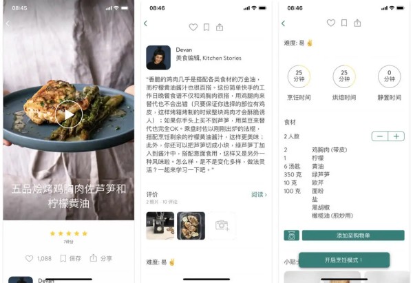 也许 Kitchen Stories 的主界面布局看起来与同类 App 相差无几,但是打开食谱详情页面,便会发现里面别有洞天。顶部一张高质量、令人垂涎欲滴的菜肴成品照片之下,依次是食谱作者的介绍、各阶段准备用时、所需的厨房用具与食材和详细的烹饪步骤分解等内容。