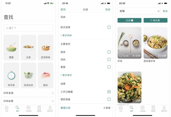 上班族们也许每天下班时都会进行「吾日三省吾身:晚上吃什么」的挣扎,这时不妨在查找页试试对感兴趣的食物或食材进行搜索,同时为搜索增加过滤选项,比如若需要短时间内制作一份快手菜,可以在过滤条件中勾选「主菜」、「工作日晚餐」,应用便会只展现制作时间较短的主食类相关食谱,并在卡片结果的右下角显示烹饪所需时间。