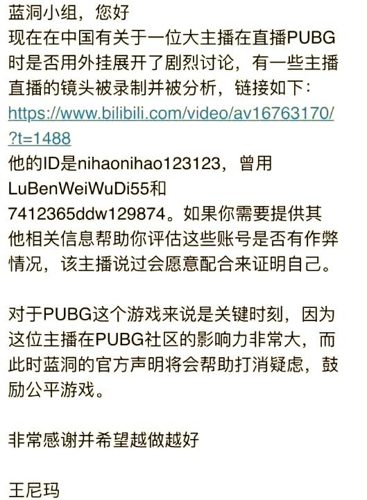 接下来,让我们一同审视那份中文版的邮件。王尼玛公开支持松鼠,呼吁《绝地求生》官方对此事表态,并传达对松鼠的敬意。