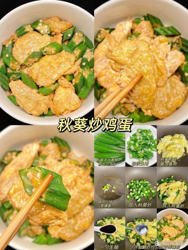 步骤3:打入鸡蛋,翻炒均匀,使鸡蛋和秋葵充分混合。