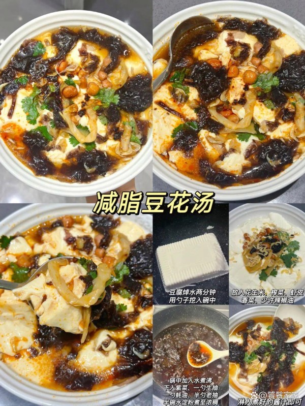 步骤3:将煮好的汤汁倒入豆腐碗中,然后放入花生米、榨菜、虾皮、香菜和少许辣椒油,即可食用。