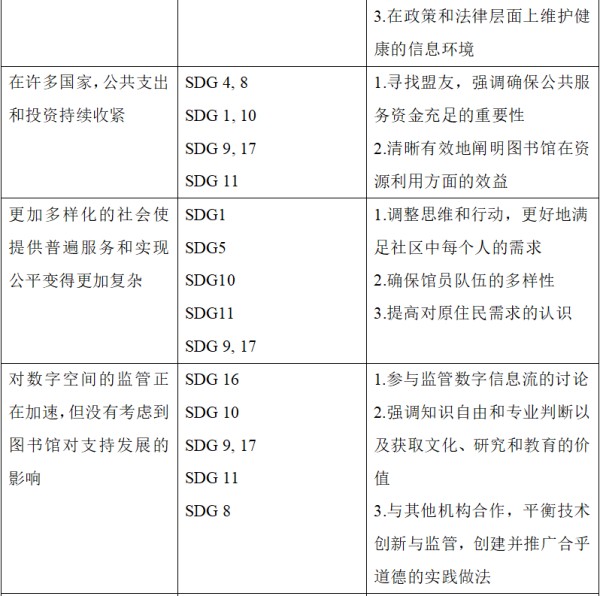 2023年版趋势报告聚焦于一个核心问题:图书馆如何对实现联合国可持续发展目标(SDGs)做出贡献?报告旨在深入探讨图书馆未能实现可持续发展目标的原因,由此提出了可能阻碍图书馆发展的12种趋势。重要的是,针对这12种不利于图书馆发展的趋势,报告给出了相应的建议,着意于帮助图书馆克服种种障碍、成为更强大的发展伙伴。