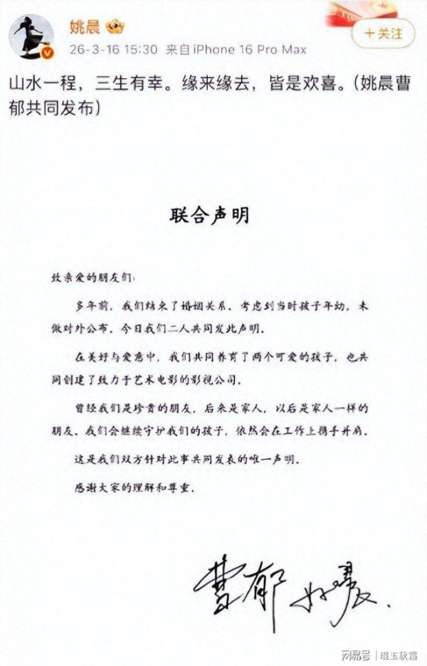 姚晨曹郁发布离婚声明:多年前已结束婚姻,为保护孩子未公开