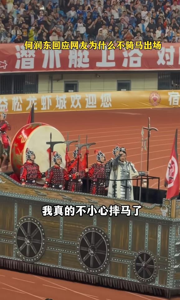 据4月18日晚间报道,江苏宿迁的“苏超”联赛主场,何润东以一袭经典的“西楚霸王项羽”造型亮相,瞬间点燃全场。然而,当观众发现这位“霸王”并未如期待中策马登场,而是驾着战车绕场时,热议随之而来——当年的马上英雄,为何不骑马了?