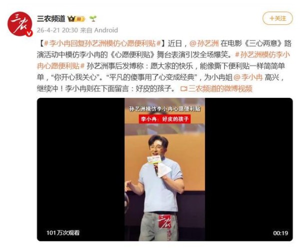 路演结束后,孙艺洲特意发博,引用歌词写道:愿大家的快乐,能像撕下便利贴一样简简单单,“你开心我关心”。他还感慨“平凡的傻事用了心变成经典”,并为李小冉感到高兴,喊话“继续冲!”